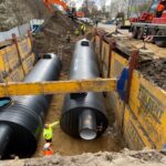 Przy ul. Skłodowskiej-Curie trwają prace związane z budową nowego odcinka sieci kanalizacji deszczowej. Dziś od wczesnych godzin porannych rozpoczęto montaż separatorów, których zadaniem jest oczyszczanie wody opadowej, która trafia do kanału Gęśnik.