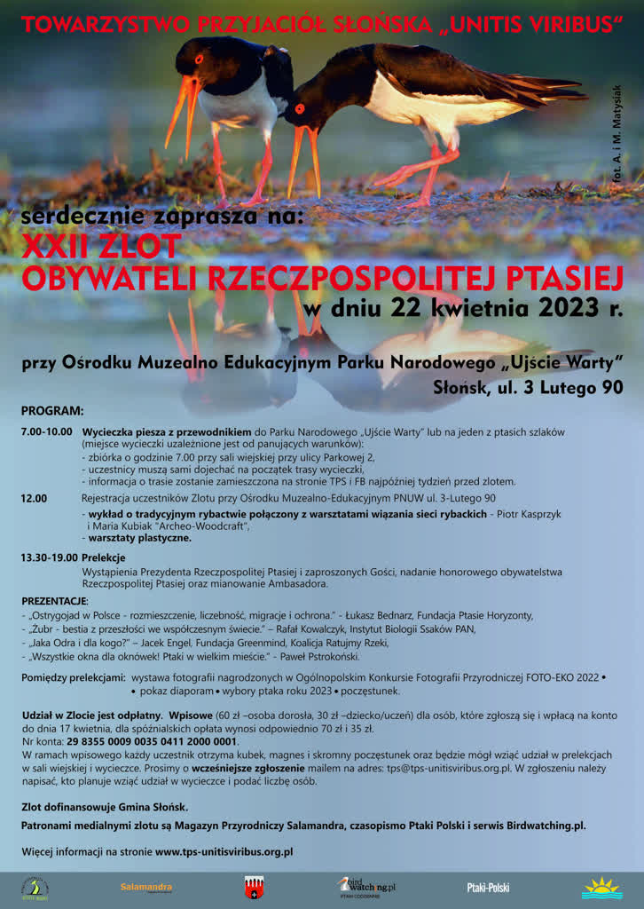Towarzystwo Przyjaciół Słońska „Unitis Viribus” już po raz 22. zaprasza na Zlot Członków Rzeczpospolitej Ptasiej. Spotkanie odbędzie się 22 kwietnia w Ośrodku Muzealno- Edukacyjnym Parku Narodowego Ujście Warty.