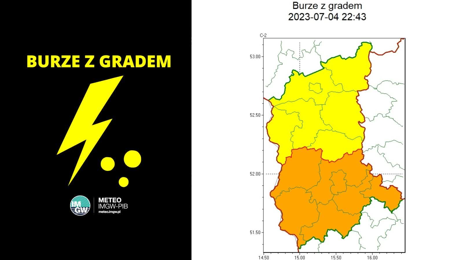 „Początek nocy ze środy na czwartek bardzo dynamiczny i niebezpieczny we wschodniej połowie kraju. Tam jeszcze kontynuacja popołudniowych i wieczornych burz z opadami deszczu do 15-20 mm i silnymi porywami wiatru, do 90 km/h. Burzom nadal towarzyszyć może grad”