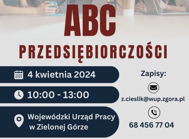 Wojewódzki Urząd Pracy w Zielonej Górze zaprasza na szkolenie pt. ,,ABC przedsiębiorczości”. Jest to spotkanie kierowane do osób, które planują otworzyć własną działalność.