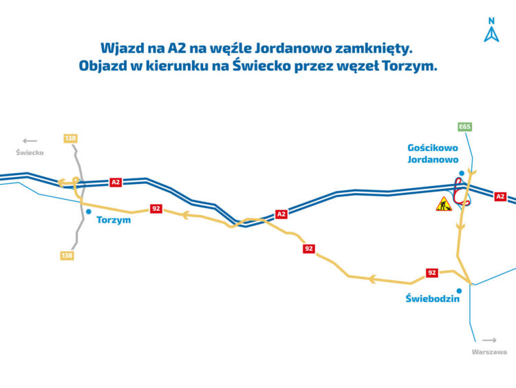 Kierowcy chcący wjechać na autostradę A2 w kierunku na Świecko będą proszeni o skorzystanie z objazdu prowadzącego do węzła Torzym, tj. objazd drogą krajową nr 92 w kierunku Torzymia, następnie drogą wojewódzką nr 138 do węzła Torzym, gdzie będą mogli włączyć się do ruchu na autostradzie w kierunku Świecka.