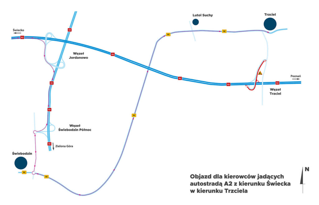 · Dla kierowców jadących od strony Świecka objazd prowadzi przez węzeł Jordanowo, drogę ekspresową S3 do węzła Świebodzin Północ. Następnie drogą DK 92 do Trzciela.