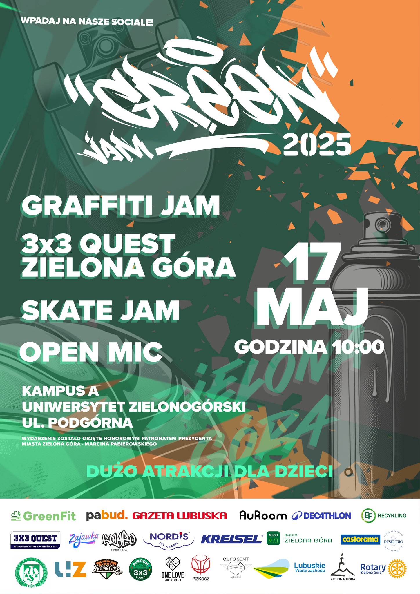 Jam graffiti z udziałem artystów z Polski i Europy, zawody deskorolkowe oraz zawody koszykówki ulicznej – to niektóre z atrakcji majowego Green Jam. Impreza odbędzie się 17 maja 2025 na kampusie A Uniwersytetu Zielonogórskiego.