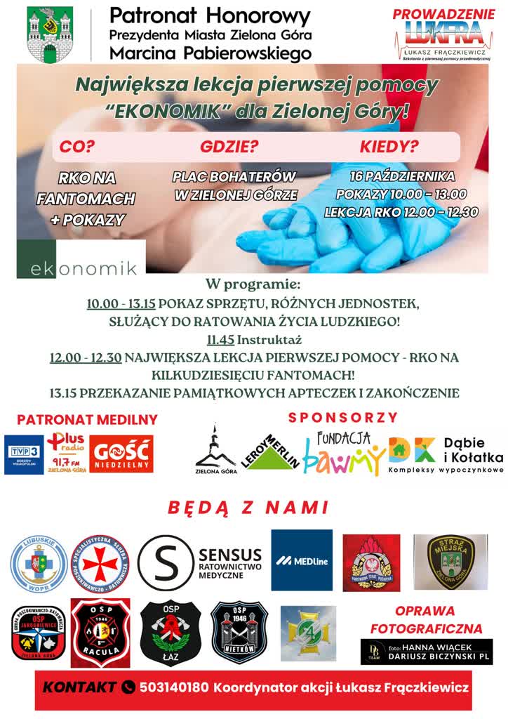 Największa lekcja pierwszej pomocy. Jutro na Placu Bohaterów w Zielonej Górze ruszy otwarta akcja resuscytacji na fantomach, którą organizuje „Ekonomik” przy wsparciu WOPR-u oraz służb ratowniczych i mundurowych.