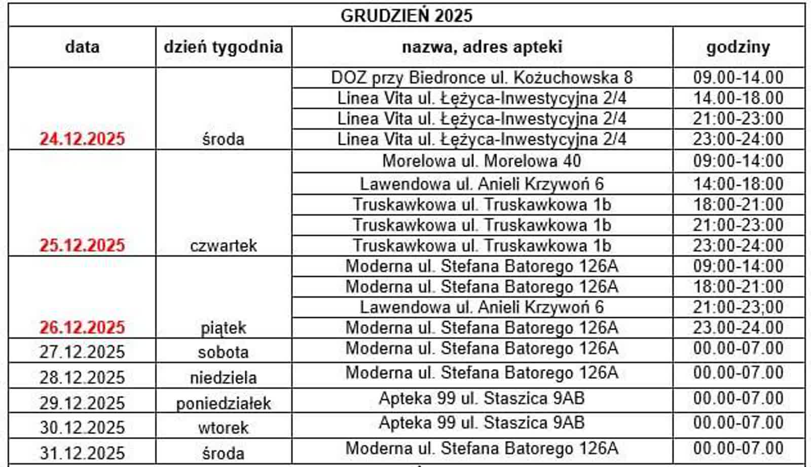– Na każdej aptece znajdą się informacje z godzinami i adresami aptek, które w danym dniu będą pełnić dyżur – dodaje Daria Wielogórska-Rutka: