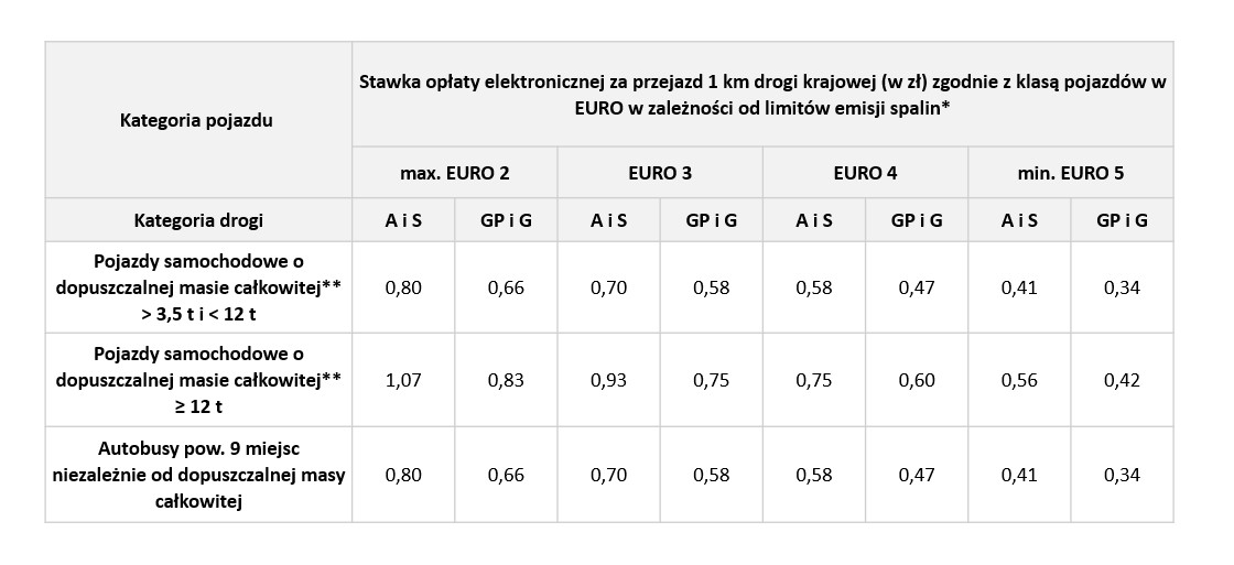 Z rozporządzenia w sprawie dróg krajowych lub ich odcinków, na których pobiera się opłatę elektroniczną, oraz wysokości stawek opłaty elektronicznej, wynika że stawki za przejazd siecią dróg płatnych pojazdów o masie powyżej 3,5 t i autobusów wzrosły o 40-42 proc., w zależności od klasy emisji spalin i masy pojazdu.