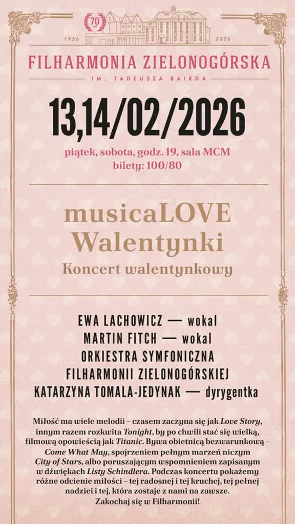 „MusicaLOVE” – pod takim tytułem Filharmonia Zielonogórska proponuje muzyczne Walentynki. Koncerty odbędą się 13 i 14 lutego o godzinie 19:00.