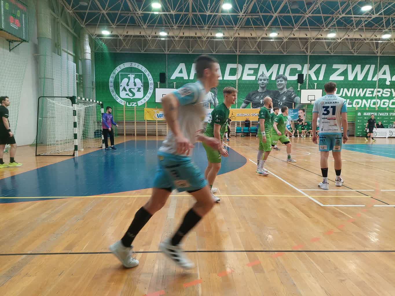 Początek spotkania był bardzo dobry w wykonaniu gości, którzy po ośmiu minutach prowadzili 5:1. Reakcja trenera gospodarzy Ireneusza Łuczaka, spowodowała, że w 14 minucie był remis 6:6, a pierwsza połowa zakończyła się prowadzeniem AZS-u 18:11. Duży wpływ na postawę przyjezdnych miała czerwona kartka, którą ujrzał Oliver Klimczak. Po zmianie stron w 40 minucie goście odrobili sporo strat i było tylko 22:18 dla akademików. Przestój trwał jednak tylko kilka minut i w 48 minucie AZS prowadził 27;18. Końcówka należała do gospodarzy, na boisku brylował zdobywca 8 bramek Mikołaj Piotrowski, a zespół gości doznał kolejnego osłabienia, bo za trzecią 2 minutową karę na trybuny został odesłany Patryk Baliński: