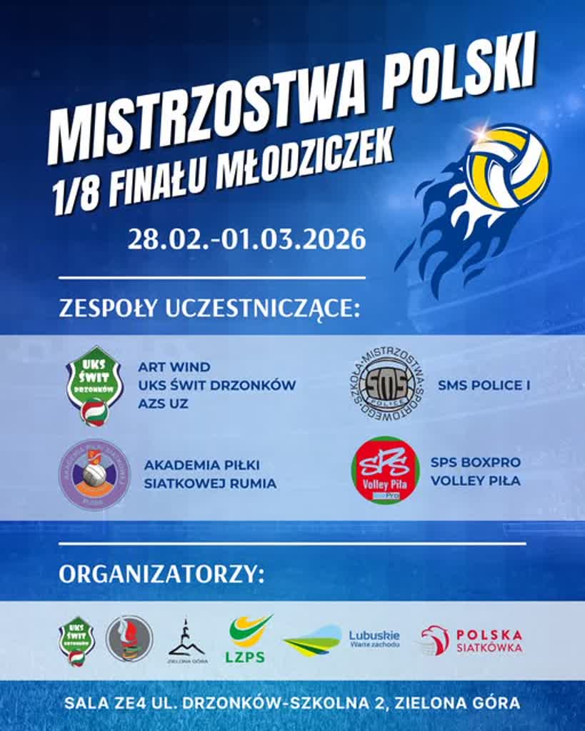 Art Wind UKS Świt Drzonków AZS UZ będzie gospodarze,turnieju siatkarek 1/8 mistrzostw Polski młodziczek.Zespoły uczestniczące to: ART WIND UKS Świt Drzonków AZS UZ, Szkoła Mistrzostwa Sportowego Police I, Akademia Piłki Siatkowej Rumia i SPS BoxPro Volley Piła.