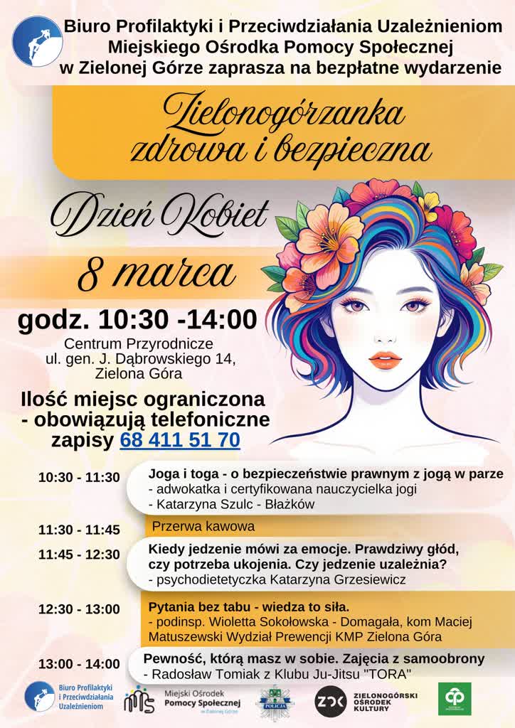 Będą prelekcje i warsztaty dotyczące świadomości prawnej, samoobrony, bezpieczeństwa cyfrowego czy jogi. W ten sposób Biuro Profilaktyki i Przeciwdziałania Uzależnieniom Miejskiego Ośrodka Pomocy Społecznej zaplanowało Dzień Kobiet. 8 marca Zielonogórzanki mogą wziąć udział w kilkugodzinnym wydarzeniu, jakie odbędzie się w Centrum Nauki Keplera-Centrum Przyrodniczym. Mówi Zofia Szozda, kierownik Biura: