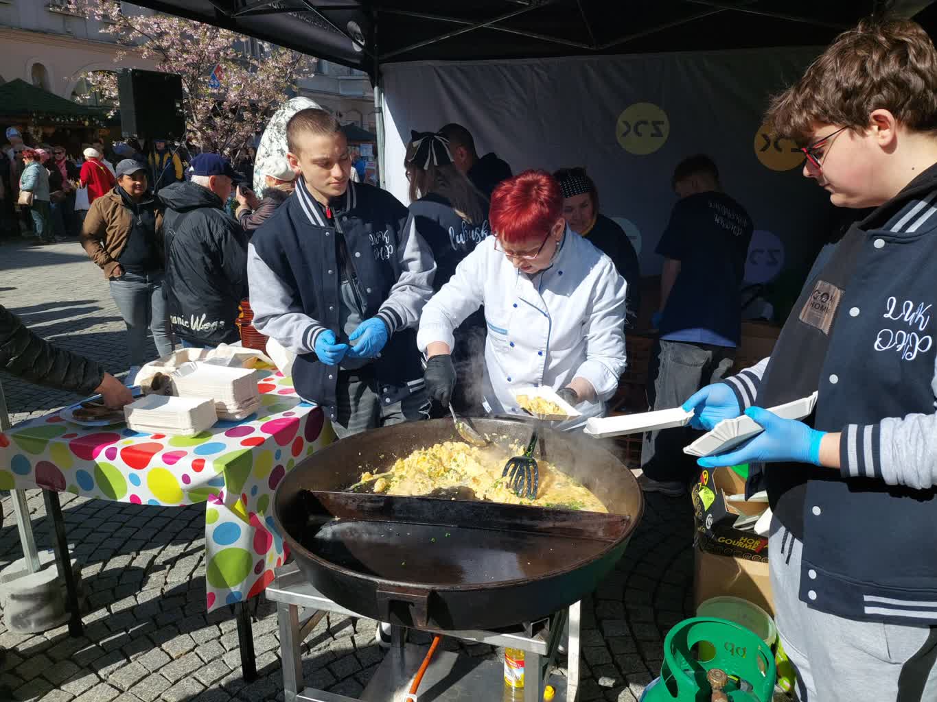 Jajecznica z 500 jaj, chleb ze smalcem oraz ogórki kiszone – to kulinarne atrakcje, które przygotowali na deptaku uczniowie i pracownicy z Ochotniczego Hufca Pracy. Wszystko to w ramach trwającego jarmarku wielkanocnego.