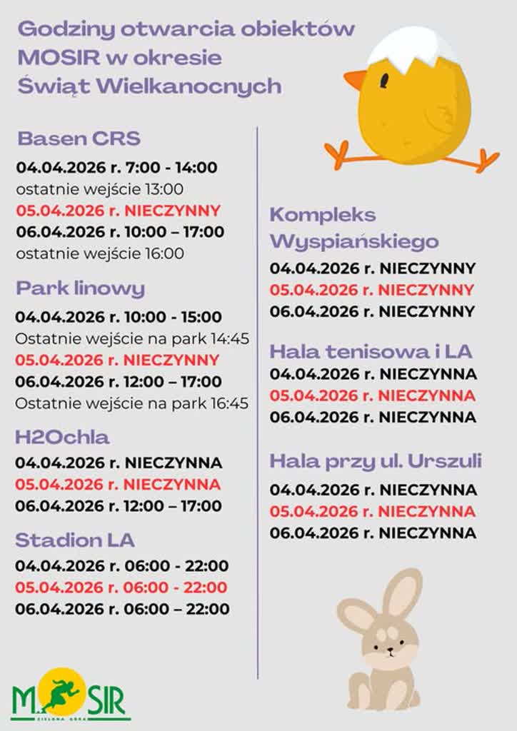Miejski Ośrodek Sportu i Rekreacji w Zielonej Górze podał godziny otwarcia w okresie świątecznym. Basen Centrum Rekreacyjno – Sportowego przy ul. Sulechowskiej będzie czynny 4 kwietnia od 7.00 do 14.00. W Wielkanoc będzie zamknięty, a w Lany Poniedziałek, 6 kwietnia, z obiektu skorzystamy od 10.00 do 17.00. Kąpielisko H2Ochla zostanie udostępnione 6 kwietnia miedzy 12.00 a 17.00. Z kolei park linowy Gęsie Tarasy będzie czynny 4 i 6 kwietnia.